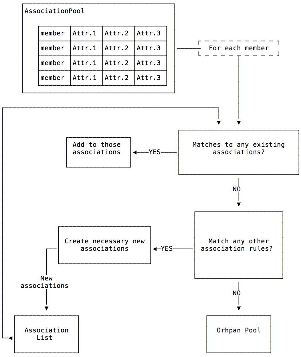 This workflow is encapsulated in the generate() function. Each member is first checked to see if it belongs to an already existing association. If so, it is added to each association it matches with. Next, the set of association rules are check to see if a new association, or associations, are created by the member. However, only associations that have not already been created are checked for. This is to prevent cyclical creation of associations.