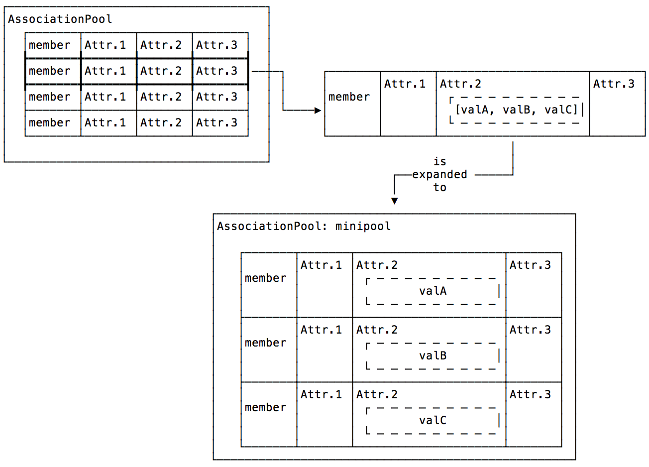 Attr.2 is a list of three values which expands into three members in the mini pool.